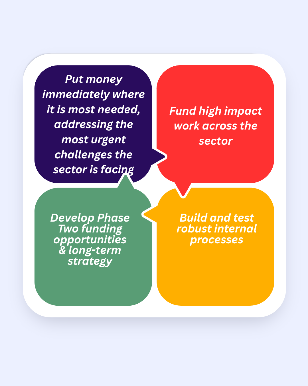 - Put money immediately where it is most needed and has the most impact, addressing some of the most urgent challenges the sector is facing at this time.